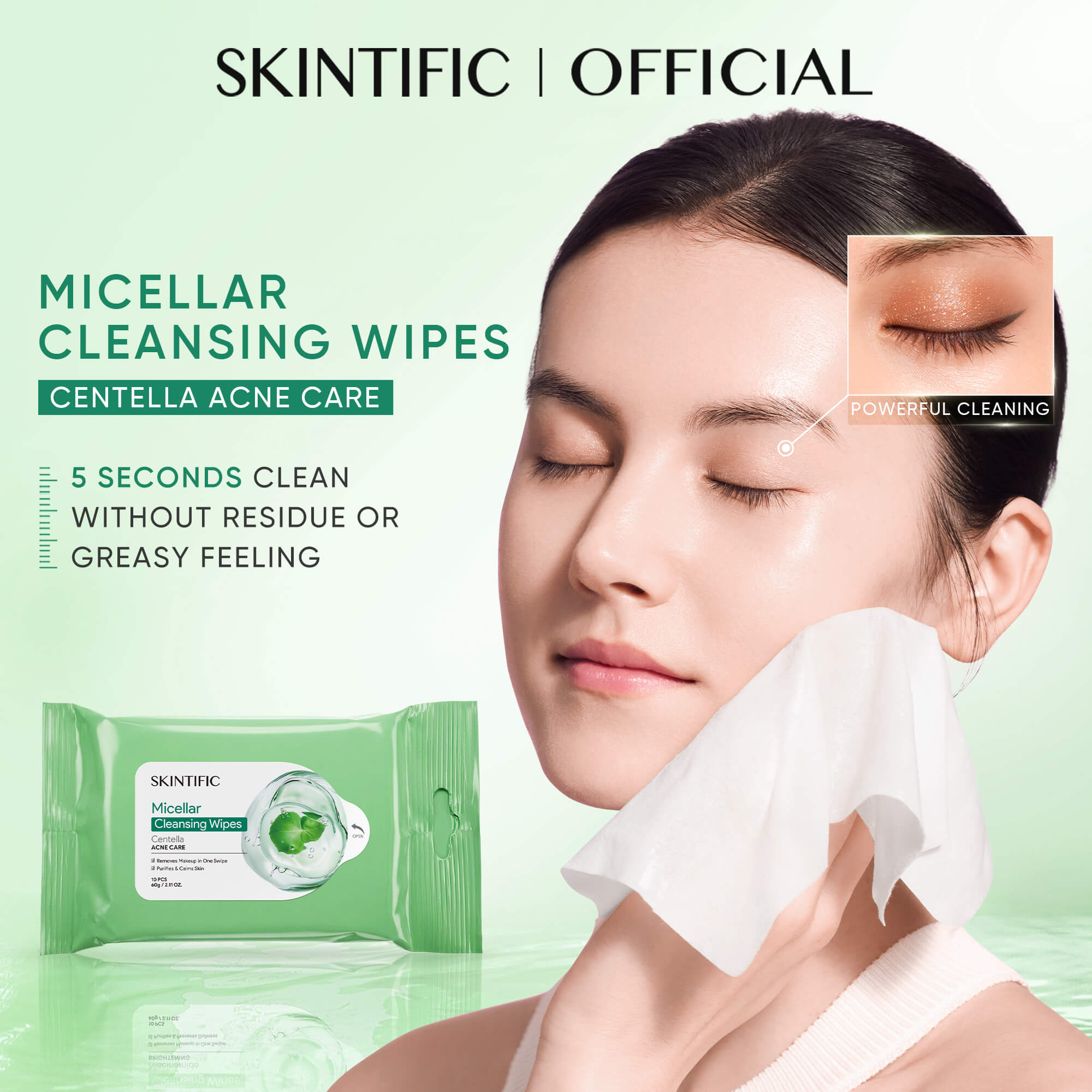 SKINTIFIC Centella Acne Care Micellar Cleansing Wipes are soft plant-derived cleansing wipes designed to remove makeup, dirt, and excess oil while helping calm acne-prone skin. Infused with centella asiatica, squalane, and jojoba oil, they help cleanse gently without stripping skin comfort.